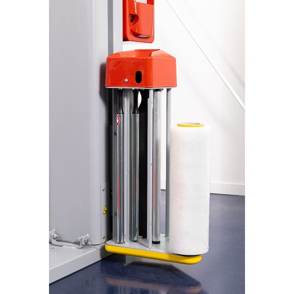 Carro equipado con preestirado fijo al 250%, Fuerza de depósito del film en la carga con ajuste desde el cuadro y controlada por celda de carga.